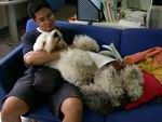這個畫面在舊辦公室看了三年,將近四年,健明是唯一可以整隻把她抱起來的男人。更誇張的是,每天下午三點,妞妞會準時去找健明,然後和健明擁抱幾分鐘。健明離職後兩年,我們搬了新家,健明來看新辦公室時,妞妞立刻和健明在沙發上,纏綿起來。為娘在一旁看了,嘆氣搖頭走開,真是白養妳一場!